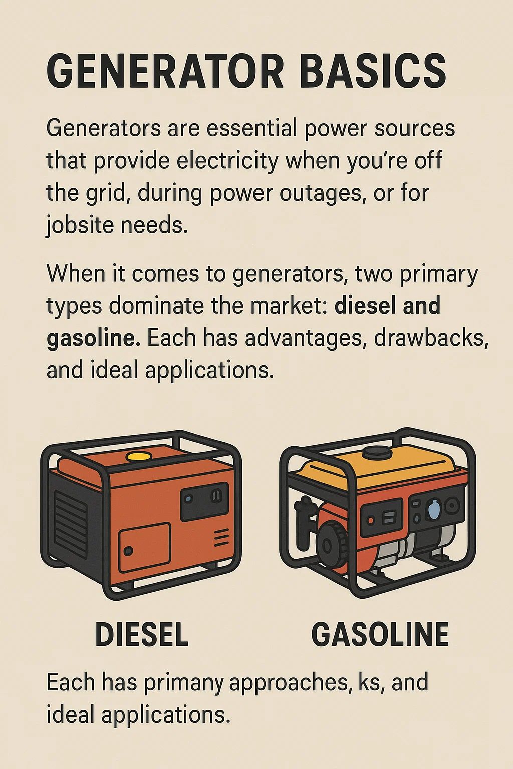 Penjana Petrol : Ini biasanya lebih baik untuk aplikasi yang lebih kecil yang memerlukan kuasa terputus-putus atau sederhana (cth., perkhemahan, perkakas rumah kecil atau kuasa sandaran untuk tempoh yang singkat).