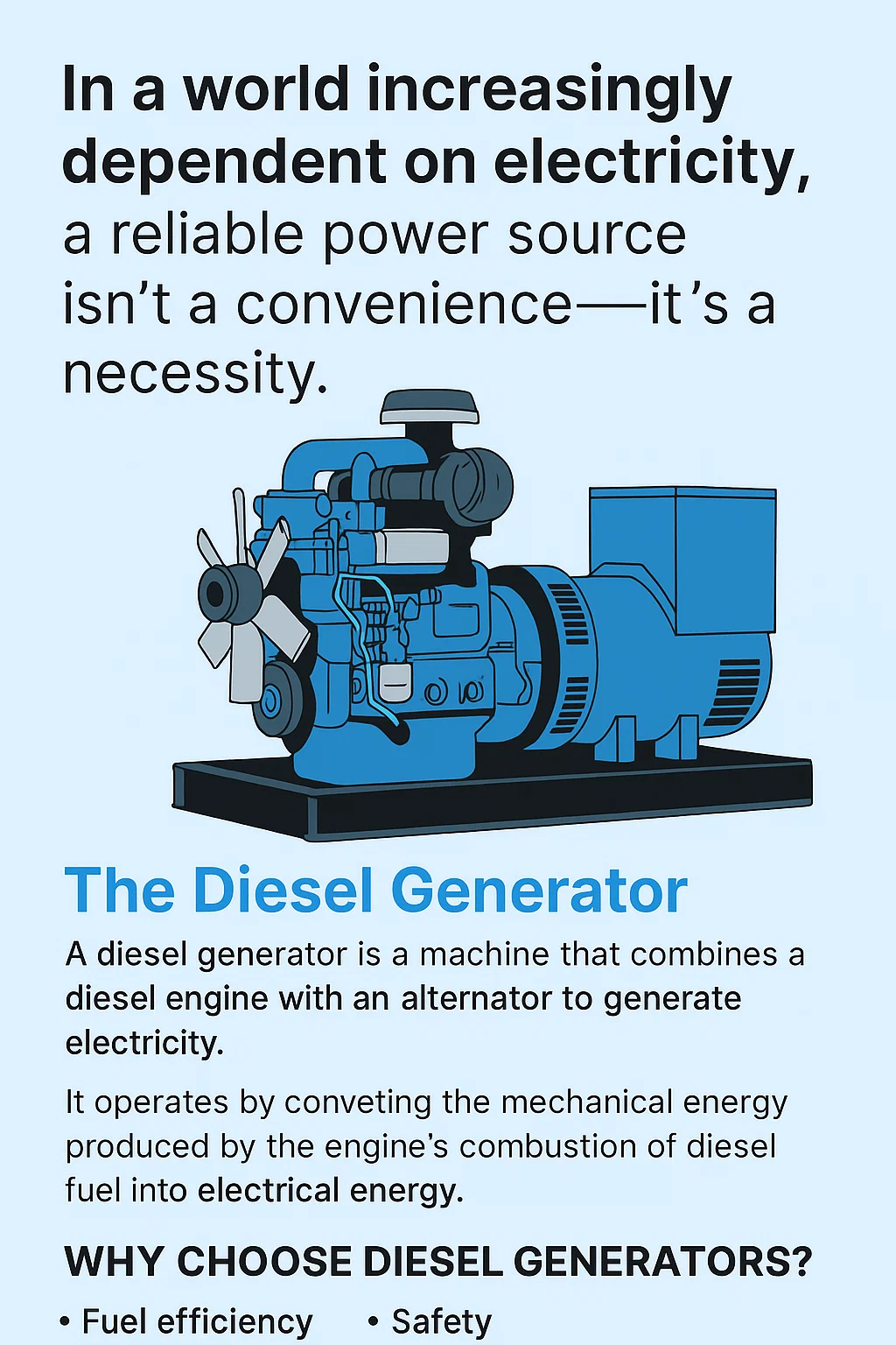 A penjana diesel , atau penjana kuasa , ialah mesin yang menggabungkan a diesel enjin dengan alternator untuk menjana elektrik . Ia beroperasi dengan menukar tenaga mekanikal yang dihasilkan oleh pembakaran enjin diesel bahan api menjadi tenaga elektrik. Jentera berkuasa ini terkenal dengan ketahanan, kecekapan bahan api, dan jangka hayat yang panjang, menjadikannya pilihan pilihan untuk pelbagai aplikasi, daripada sdanaran kediaman hingga menjana tenaga ke seluruh bdanar.